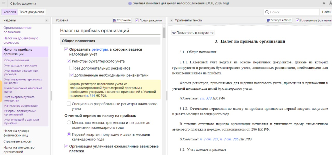 Конструктор учетной политики помогает быстро собрать документ с юридически корректными формулировками, снизить риск ошибок и претензий со стороны налоговой.